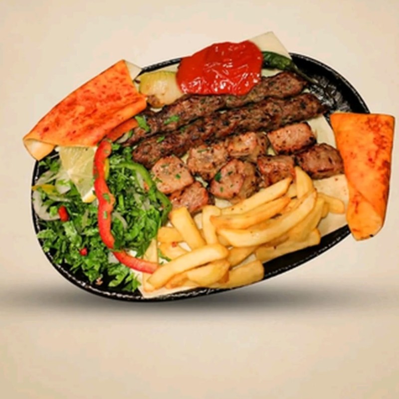 (407 سعرة حرارية)2سیخ كباب دجاج - 2 سيخ شيش طاووق - بطاطس - بصل مشوي طماطم مشوي - فلفل مشوي - سلطة بقدونس - قطعتين من الخبز المحمر بالصلصة - خبز الصاج